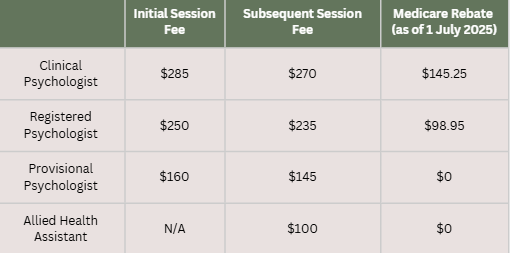 The following Medicare rebates are available each session when referred by your relevant health practitioner. Rebates as at 1 July 2025 are as follows: